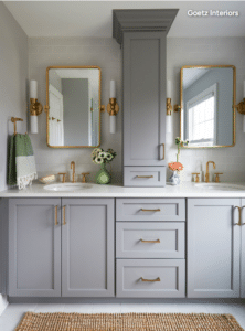 When square footage is limited, think vertically. Tall tower cabinets between dual sinks or at the end of a vanity provide hidden storage for towels and toiletries.