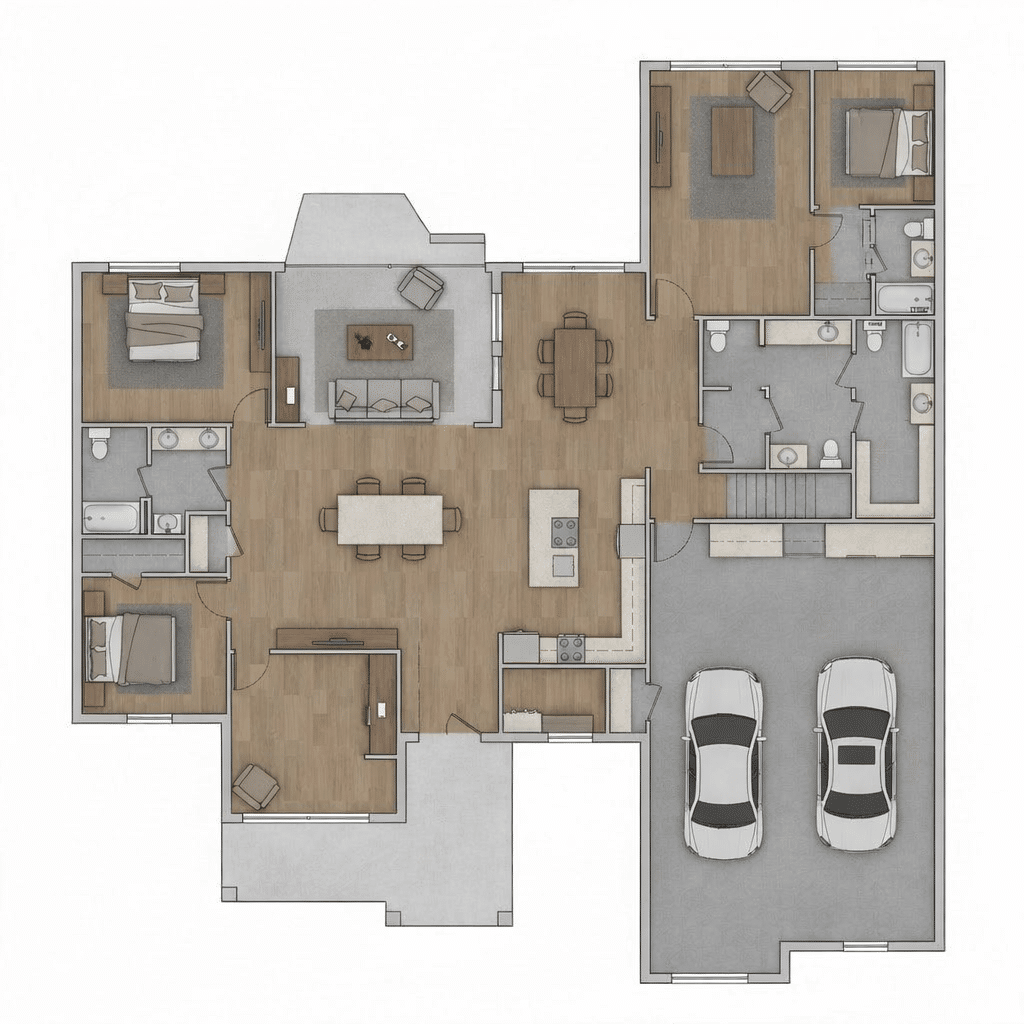 The Berkeley floor plan by Intrepid Builders is a masterclass in Modern Farmhouse design, blending timeless rustic charm with a sleek, contemporary layout. This spacious, single-story home is designed for families who value both open-concept entertaining and private, quiet retreats.