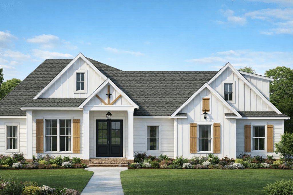 - Striking Curb Appeal: The exterior features a classic white board-and-batten finish, accented by warm wood shutters and decorative timber gables that create a welcoming, high-end aesthetic.